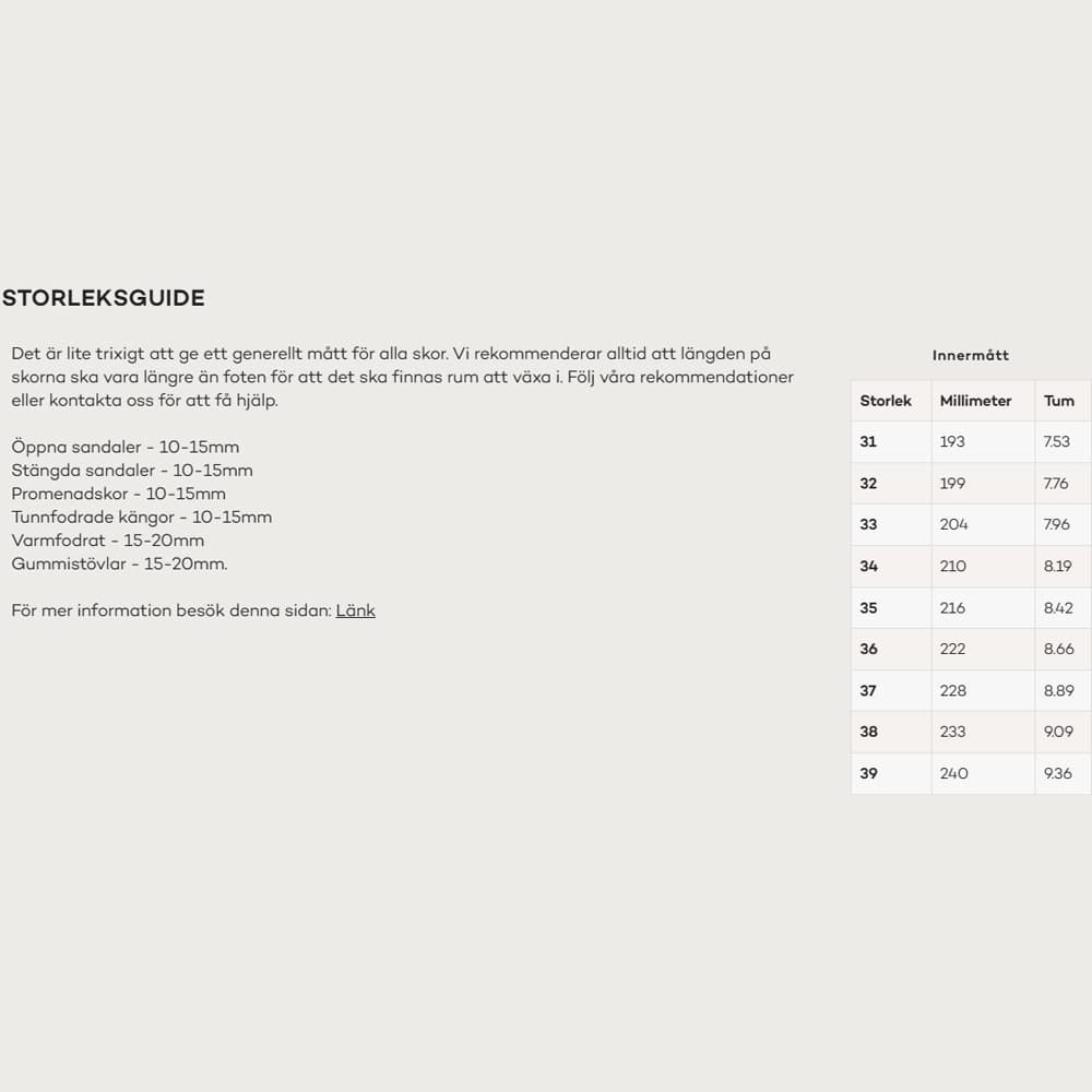 Vi rekommenderar alltid att längden på skorna ska vara längre än foten för att det ska finnas rum att växa i. Så om du är osäker på två storlekar – Välj den större för att sedan göra ett byte om den inte passar. Följ våra rekommendationer nedan eller kontakta oss för att få hjälp. (storleksguide hittar du i bildspelet)